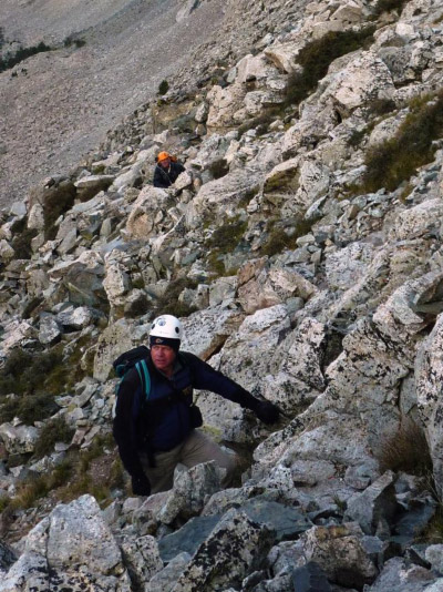 Andy taking a self-photo with Rick taking care with every step – the footing keeps your focus “in the present” for sure – and some of those rocks are loose.