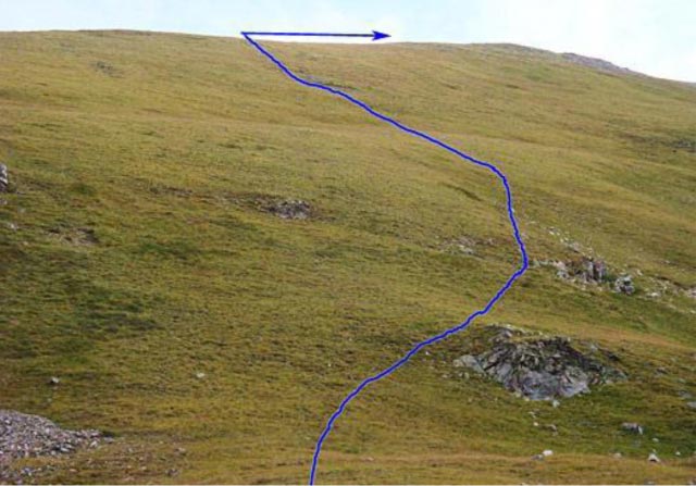 After about 1000’ of elevation gain we emerged out of tree-line and headed up a long, broad, grassy slope to reach the crest of the west ridge. All trail elements disappeared, so we just bushwhacked, assuming the mountain was up to the right somewhere.