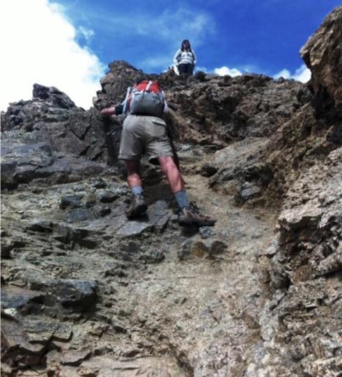 (Below) Rick down climbing the Class 3 crux of the climb. After this it was easy Class 2 to the summit.