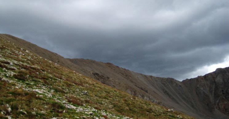 Heading down from the West ridge with rain clouds getting heavier and darker.