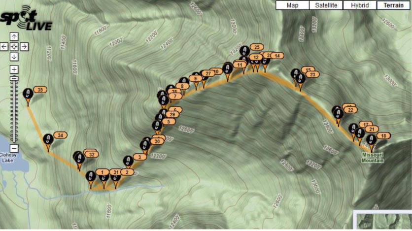 I have a new SPOT feature called Tracking – it traced our whole route – out and back with signals to satellite every 10 minutes. It’s interesting to note the closeness of the markers as we were heading uphill, and how they stretched out when we were hiking the ridge – which had a few level stretches (e.g. between marker 15 and 16. Missouri summit was at marker 18, which would be 180 minutes or 3 hours – makes sense since we started sending tracking spots about 15 minutes into the climb.