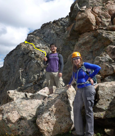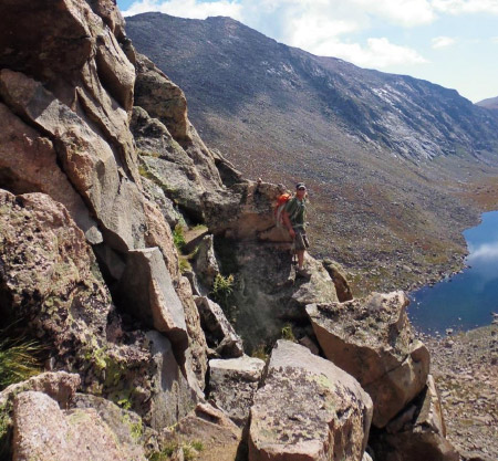 Here’s a fun part of the story. On the latter part of the ascent of Mt. Bierstadt we’d noticed a solo climber behind us who eventually came within voice range. We exchanged a few comments (we learned his name was Sam) as we were conjecturing about what route to take over the boulders to the ridge. When we got to the beginning of the Class 3 ascent, Laura later told us her inner thoughts were of nervous doubt.