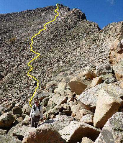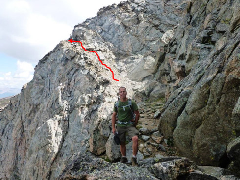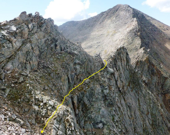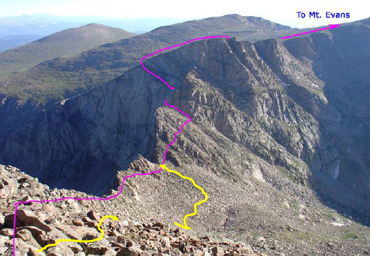 These are great shots looking back on the entire route from the distant summit of Mt. Bierstadt.   The beginning of the ledges is marked in yellow. That’s what you call “exposure” but the footing was good.