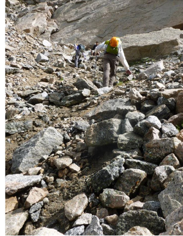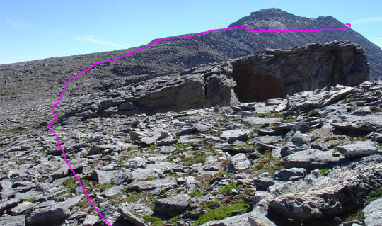 As we headed down to the ridge, unexpectedly there were cairns all over the place and no path, just boulders of increasing size. The “standard” route is shown in pink. Our first target was the lowest notch on the ridge from which the Class 3 terrain begins. We saw cairns marking a lower route (yellow) which we took, but it was no easier.