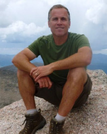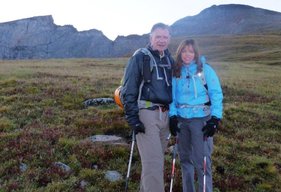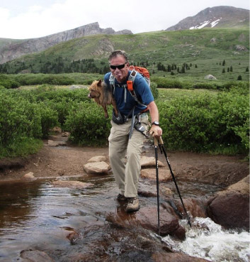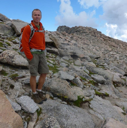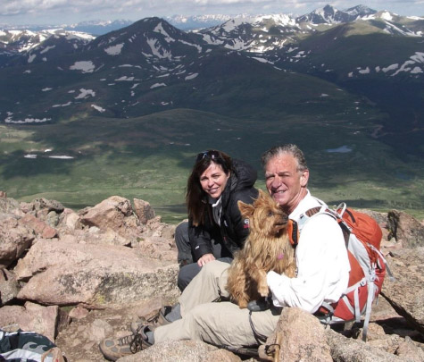 Rick C. and Laura at daybreak. Mt. Bierstadt is on the right and the Sawtooth extends from the left of Rick’s head.