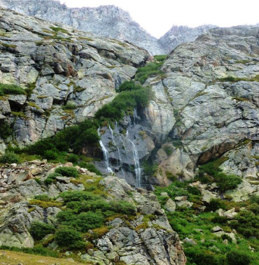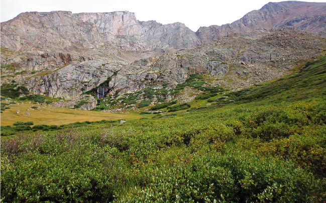 Looking back, we had come down from the upper left and then down the slope above the waterfall to the marsh at about 12,500’ below.