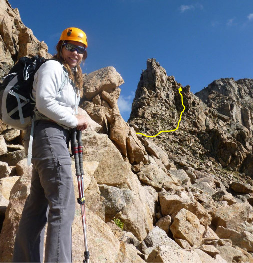 She sees for the first time the beginning of the Class 3 climbing to get over the first obstacle – a “gendarme” guarding the way – typical of what you run into with ridge traverses.