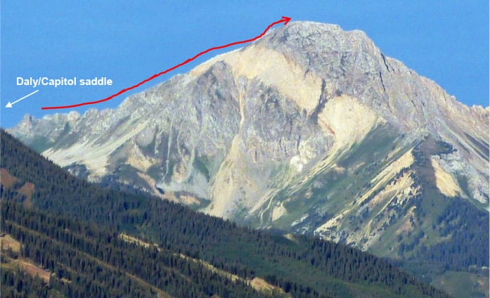 Here is a close-up of Daly from our house. The route starts with a 900’ hike up switchbacks to a saddle between Daly and Capitol ( see below), and then mostly up the narrow south ridge (in red) all the way to summit.