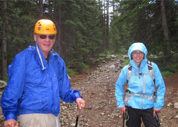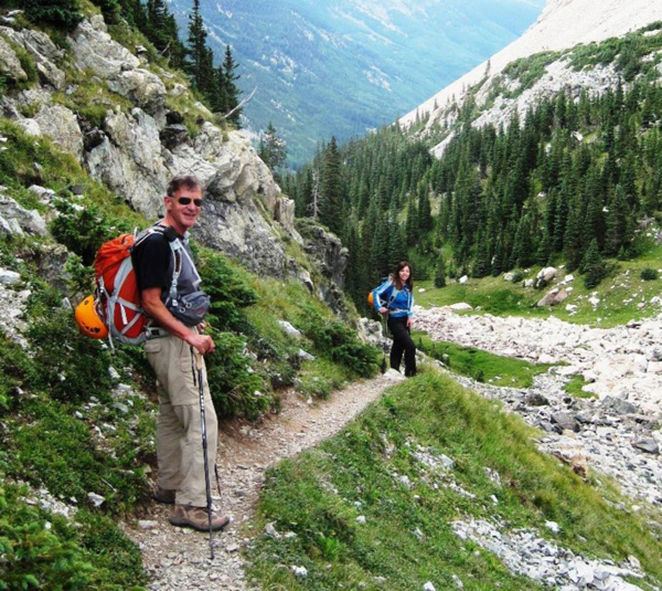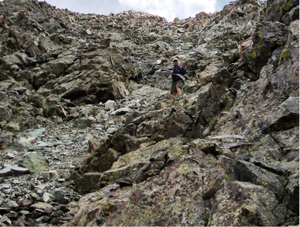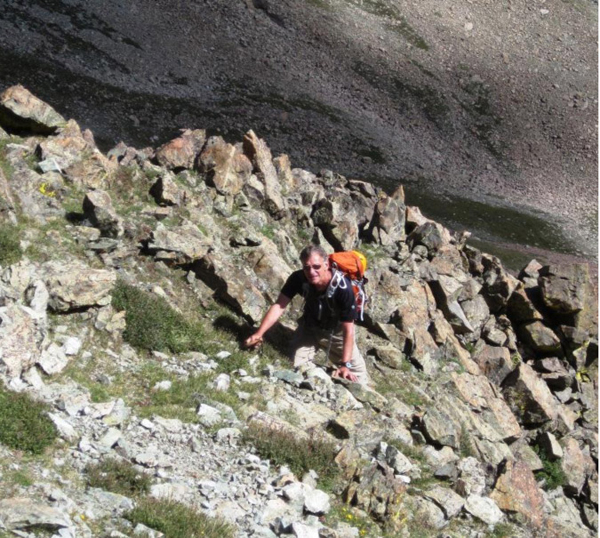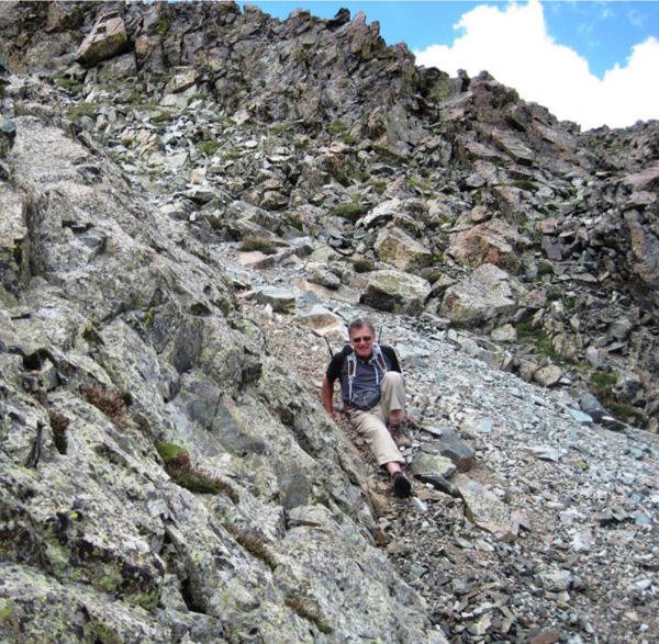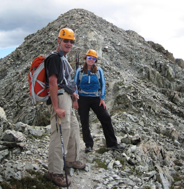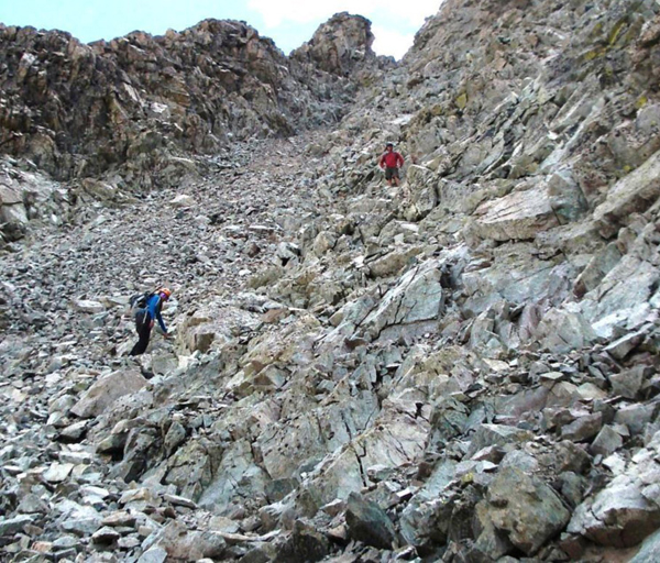 Rick C. and Laura nearing the approach to the real rock climbing – and a decision as to which approach to take towards the summit.