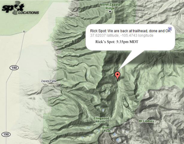 Then I was amazed to get a call from Pamela on my cell phone, which I’d inadvertently left on. She was all nervous because it had already been 8 hours since she got the Spot message from the trailhead and had not gotten one from the summit. Good that the mobile call went through because they were ready to call Mountain Rescue. I figured out what went wrong – we got off the summit really fast and coming down the North face didn’t allow the Spot to see the satellite so the summit Spot never went out – that points out a problem with the Spot service.