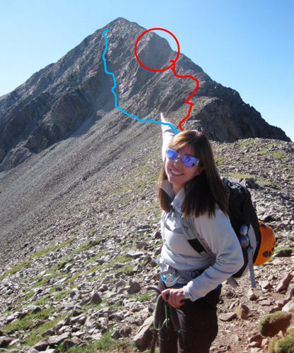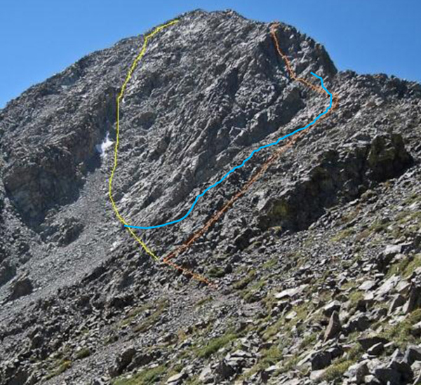 Here’s the issue: The blue line is the easier route but ascends two steep north-facing gullies with very loose rock; to avoid that we first climbed the NW ridge marked in red – Class 3 scrambling, but we were worried about that Class 4 pitch encircled in red.