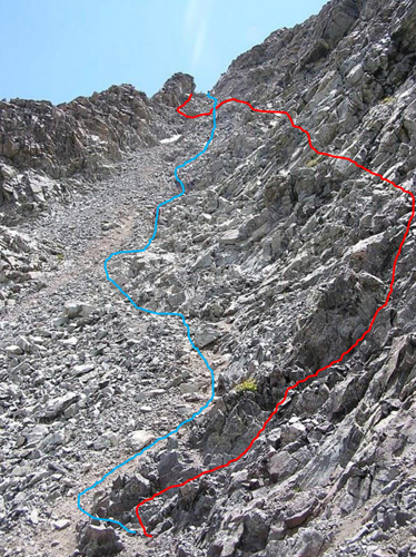 This was the first, main gully. I climbed up the rock wall up on the right side where I found solid rock on a fun Class 3 scramble (red line). Laura went up the right side of the gully (blue line) and met a few challenges which Rick P. helped with as it got steeper and looser near the top.