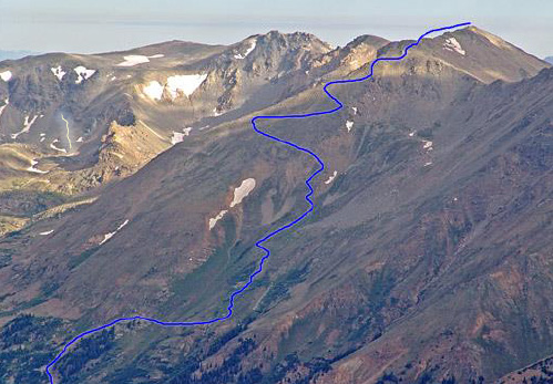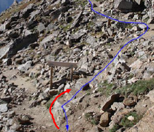 Note 2: On the ascent to the first 14,000’ ridge you’ll see the route drops slightly (blue line) to a signed junction where the longer East trail joins.