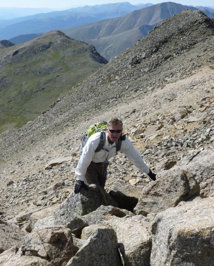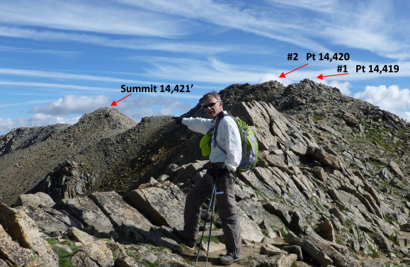 Finally on the ridge, but where’s the summit? Not #1 at 14,419 feet, nor #2 at 14,420 feet.