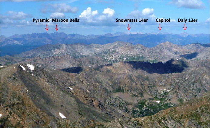 The views from the summit were terrific – everywhere you turned you saw famous 14ers. This shot shows the Elk Range surrounding Aspen.