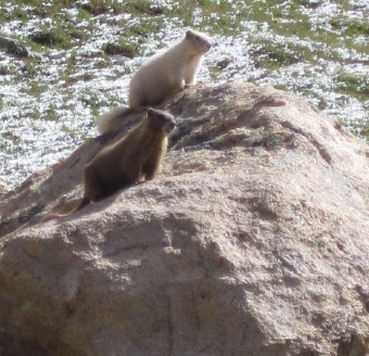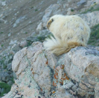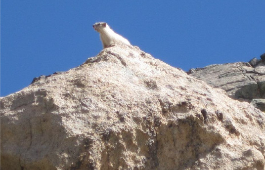 Normal Colorado Marmots are brown and they are always present on rocky slopes all the way up to summits. They are thieves so don’t leave your pack or hiking sticks unattended. Marmots are large ground squirrels that live in burrows in rock piles. They hibernate in winter.