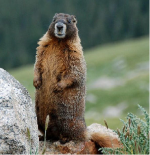 Most Marmots are highly social and use loud whistles to communicate with one another, especially when alarmed. They are 15 – 20” long not counting tails – and weigh about 7 lbs.