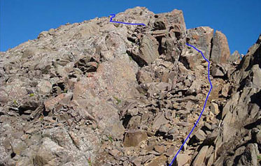 The upper half of the slope leading up to the “Lavender Col”, which is kind of a saddle. Rick hated the scree and climbed up the rocks on the left, eventually joining up with the others at the base of the upper blue arrow.