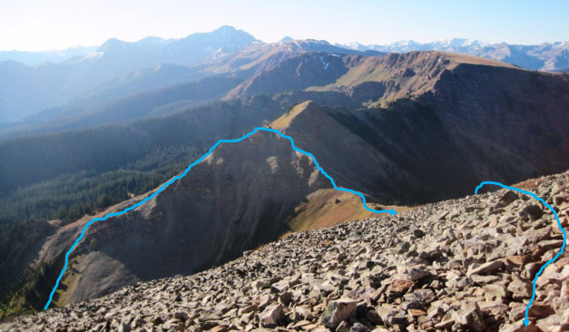 Here is the whole route, including the backpacking from the Dingle Lake parking lot 4.5 miles and 1600’ down from the campsite. The blue line traverse from the East peak goes down to a saddle and up to the second Sopris peak – which is exactly to the foot the same summit elevation as the East peak.