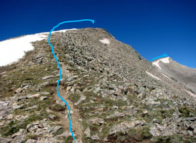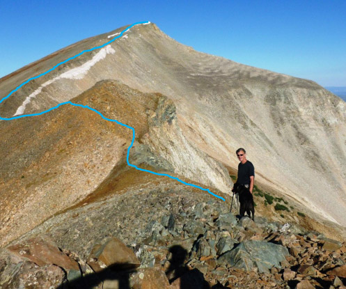 After downclimbing from the second false summit, the final approach to the real Sopris summit is in full view