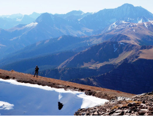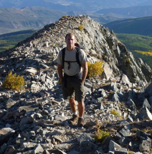 Rick on the approach ridge to the summit with Capitol Peak looming on the upper right in the background. Capitol is ranked by many as the most difficult of all the Colorado fourteeners.