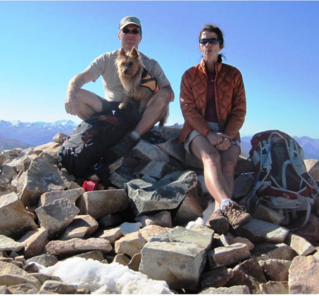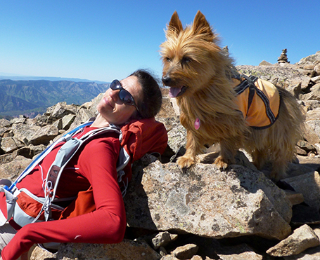 Dianna basking; Emme triumphant at the summit, her sixth this summer (but probably thinking the rocky down-climb will be no fun).
