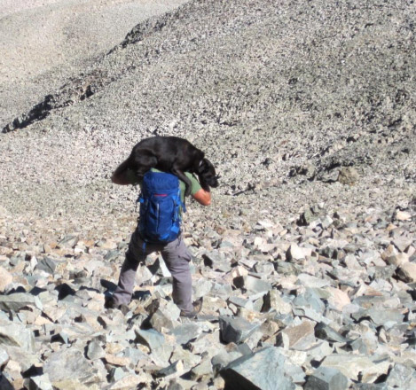 … but when Amos decided to call it quits, Brett heaved all 55 lbs. of him on his neck, on top of his 25 lb. pack – and hoofed down the entire rocky slope to the more docile saddle. That was a sight!