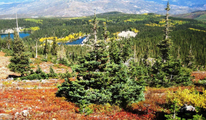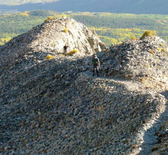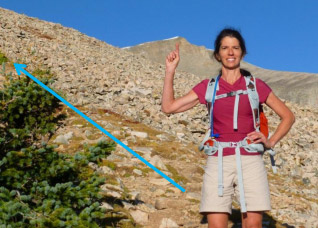 Further up towards the ridge we’re just about at tree-line. Dianna is pointing to the real objective still far away.