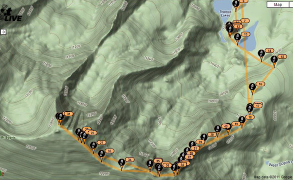Spot Satellite tracking showing our whole route to the summit and back to campsite. Pin 11 is campsite and pin 31 or 32 are summit indicators.