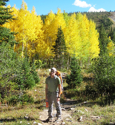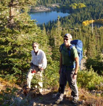 Brett (left) and me (right) hiking the old jeep road leading towards Thomas Lakes. Fall color change is evident.
