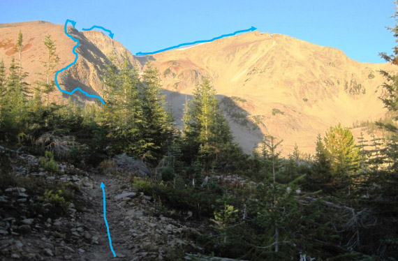 From the upper lake, we hiked to the base of the steep slope to the southeast and ascended to a good trail on the ridge.