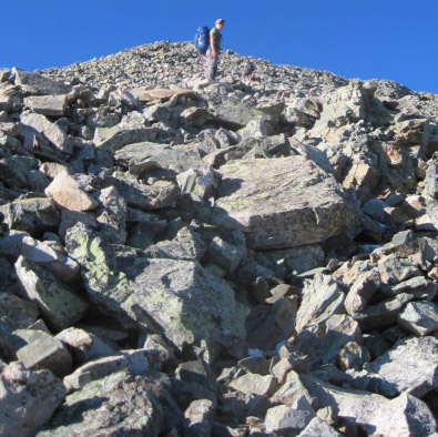 There is a good path around the lakes, then a steep uphill to an approach ridge towards two false summits on the upper left that were actually the crux of the climb due to large, sharp, steep and loose boulders.