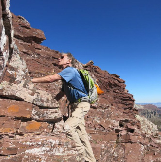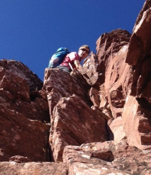 Rick S. entering the ledges and cliff bands leading to the NW ridge crest.