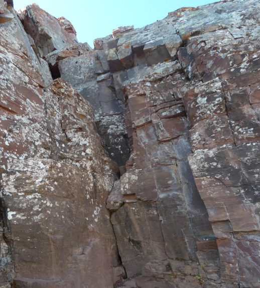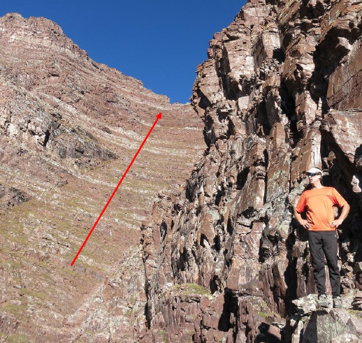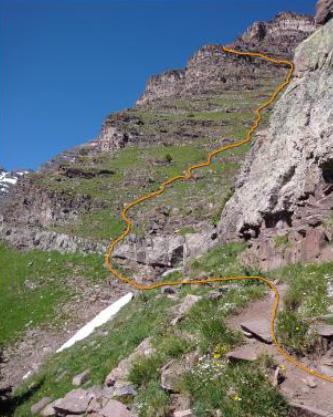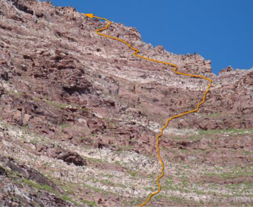 After another 400’ of vertical, we finally arrive at the cliff band that is the crux of the climb. A portion of it is shown here. This is Class 4 exposed climbing but we found a way up it.