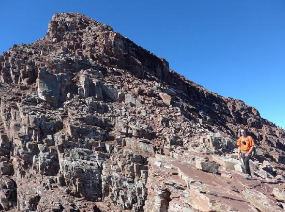 Above the cliff band the remaining route to summit is very loose but mostly not as steep as what we’d just done. Somewhere half-way up this, for the first time I actually got the feeling summiting was possible!