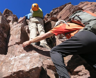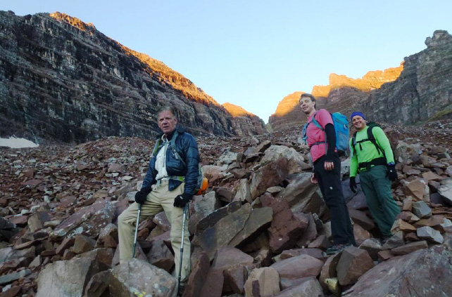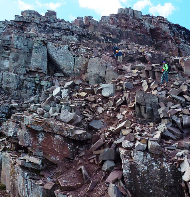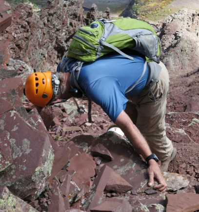 We still had hours of rock down-climbing to go but with careful selection to find solid rock (it doesn’t look like anything is solid in this picture),
