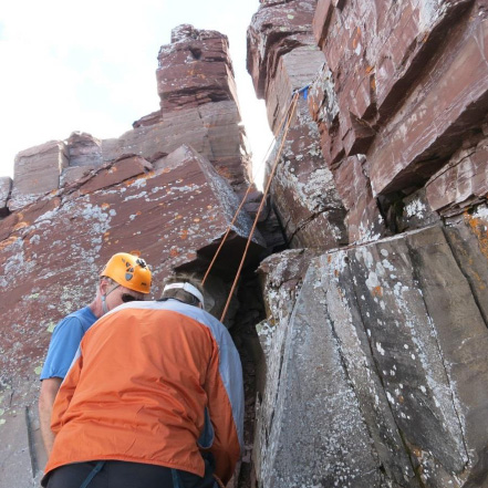 He gave me a harness to put on, put one on himself, and then climbed up to rig a rope for rappelling down the cliff.