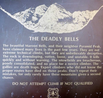 The reputation of casualties on the Bells comes largely from North Maroon Peak. After 2 deaths in 2012, Aspen Mountain Rescue climbed the peak to see if anything new was causing the deadly falls which usually occur at the upper reaches where there are vertical chimneys, cliff bands and loose rock.
