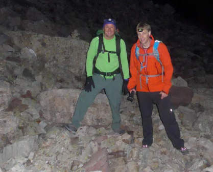 We hiked in the dark for 2 ½ hours, up to and past Crater Lake and almost to the “rock glacier” by the time dawn came.