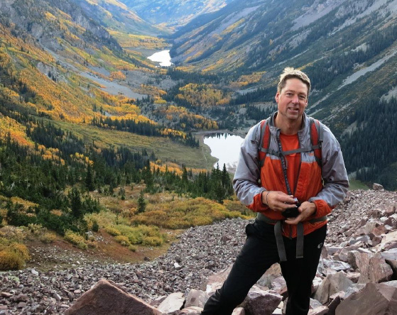 Andy relaxes after crossing the rock glacier. As the sun rose, the flaming Fall colors of Aspen trees turning yellow created the ultimate Fall scene. Maroon Lake (our start for the day) is in the distance and Crater Lake is just behind and below Andy.