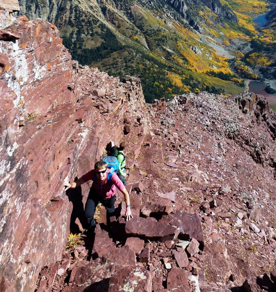 Almost any visitor to Aspen will make the drive to Maroon Lake to see “the Bells.” The Maroon formation is made up of iron-stained siltstone forming the brilliant blood-red colors of the Bells and Pyramid Peak. Skilled climbers will describe North Maroon Peak, the most visible from the Lake, as one of their favorites of all the 14ers. It is likely that’s because the views on the way up and at summit are among the most impressive of all the 14ers.