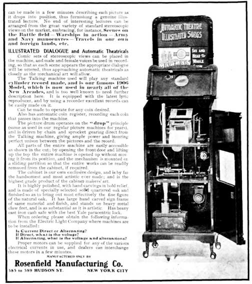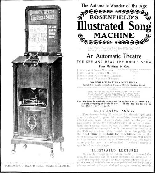 The Rosenfield catalog claims: “. . . as illustrated songs are really more popular now then when first introduced nearly a quarter of a century atfo. . . ” Now, what was around in 18H2? They must have been thinking of something. Rosenfield was established in 1890 as a manufacturer ot coin-operated machines. Patents on some of its machines date back to July, 1894.
