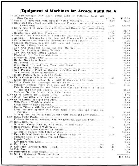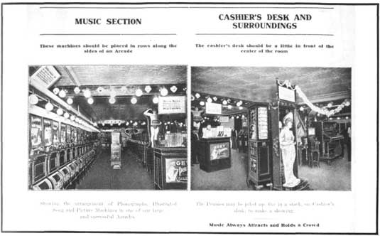 It is very essential to have good music, as it always attracts and holds a crowd. Place the music in front near the door, so that it can be heard from the outside. It is necessary to preserve the best of order allowing no loafing, flirting or boisterous characters. Women and children are the best customers and an Arcade should be run in such a manner as to make it an appropriate place for them to visit. Pictures in all machines which show them, should be changed at frequent intervals at least every month, and the same applied as well to phonograph records. Keep close watch of the collection from each machine. When they appear to be decreasing materially, it is good evidence that a change is necessary. When any unusual public event, which attracts widespread nocice occurs, such as a great murder trial or a disaster like the San Francisco earthquake, the manager of an Arcade should be quick to avail himself of the opportunity thus afforded for reproducing through picture, phonograph and illustrated song machines, these events, as they will attract big crowds.