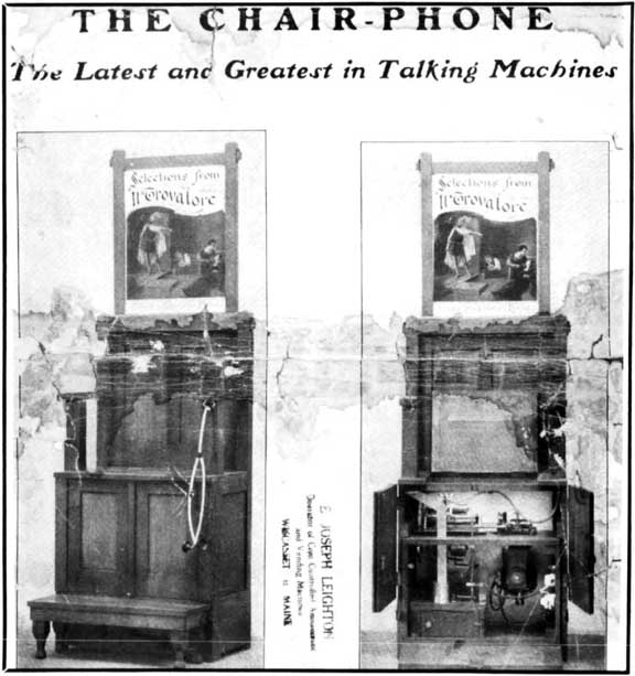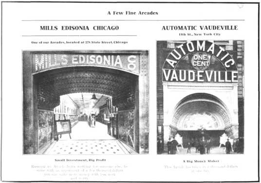 The year 1900 marked the initiation of the Penny Arcade idea (according to the Mills Novelty Co., who should know). The Arcade became a focal point for early music-machine exposure. Here the standup ear tube phonograph came into popular commerical use, the most interesting versions being the so-called Illustrated Song Machine produced bv Mills, Rosenfield and Caille.