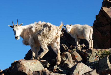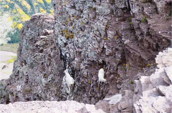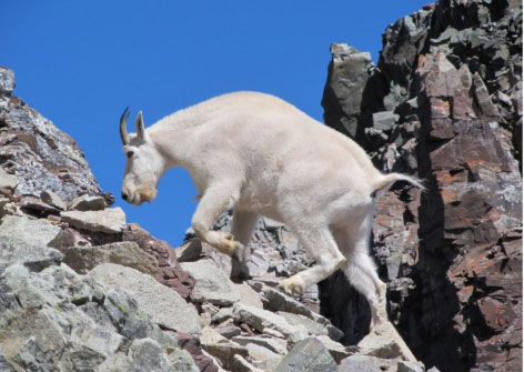 Their climbing abilities are amazing and we saw a young goat with similar no fear. So I looked them up – they have a double coat that can withstand temps to -50 F and winds up to 100 mph. Their feet are well-suited for climbing steep, rocky slopes, sometimes with pitches of 60 degrees or more, with inner pads that provide traction and cloven hooves that can be spread apart as needed. Also, the tips of their feet have dewclaws that are sharp to keep them from slipping. Throughout the year they usually stay at or above tree line. Mountain goats are herbivores and spend most of their time grazing. Their diet includes grasses, herbs, sedges, moss, twigs and leaves from the low-growing shrubs and conifers at tree line.