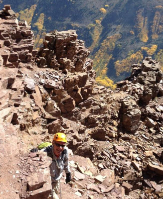 “Down-climb facing in to the mountain and always keep your arms out to push your upper body away from the mountain and stick your ass way out so your body pushes your feet into the mountain, then your toes will stick.” Oh yeah. I remember son Brett telling me that on Sunlight, but it’s not what your brain wants you to do, so you’ve got to force yourself into it.