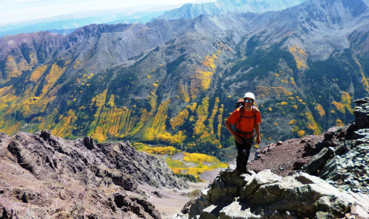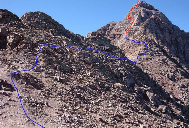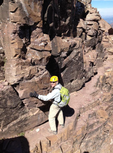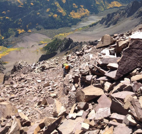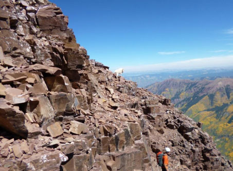 SummitPost.com: “This route could very well be the steepest sustained route you have ever encountered on a mountain. The route from the trailhead to the 12,800’ saddle is relentlessly steep. The last 1000’ is continuous tough Class 3 and Class 4 climbing. In just under 4 miles you’ll get to gain 4550’ in elevation, so be prepared for some serious climbing! The geology falls into the crumbling, sedimentary category. All 14,018’ of this magnificent mountain can be described by the three R’s: red, rugged and rotten.”