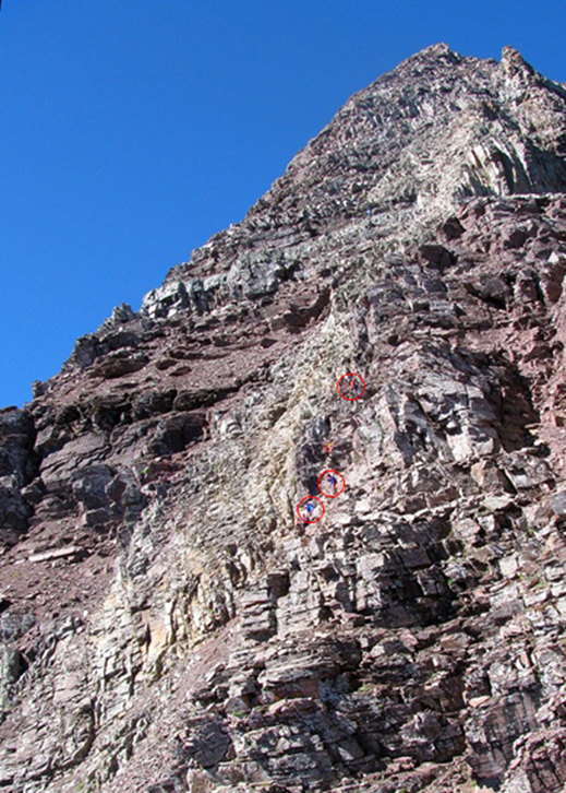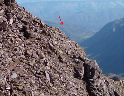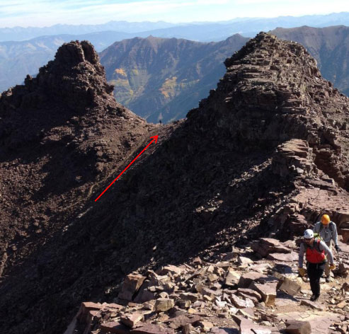 Helmets donned, Andy (white) and Rick (orange) heading up the 200’ to the “ledges,” our next objective. The arrow is the 1000’ gully we’d just ascended.