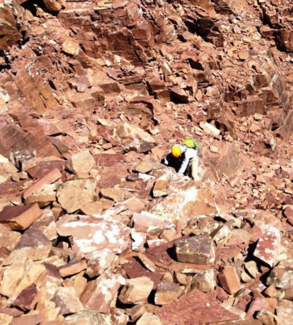 Rick trekking up the loose gully with the valley floor already over 2500’ below.