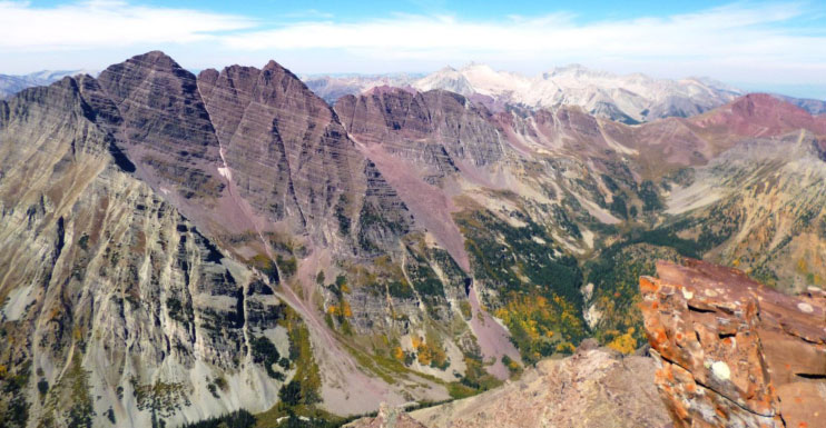 Views as far as the eye can see – no smoke! Maroon (left) and North Maroon (to its right); the whitish peak in the middle background is Snowmass Mountain and to its right is Capitol – all fourteeners.